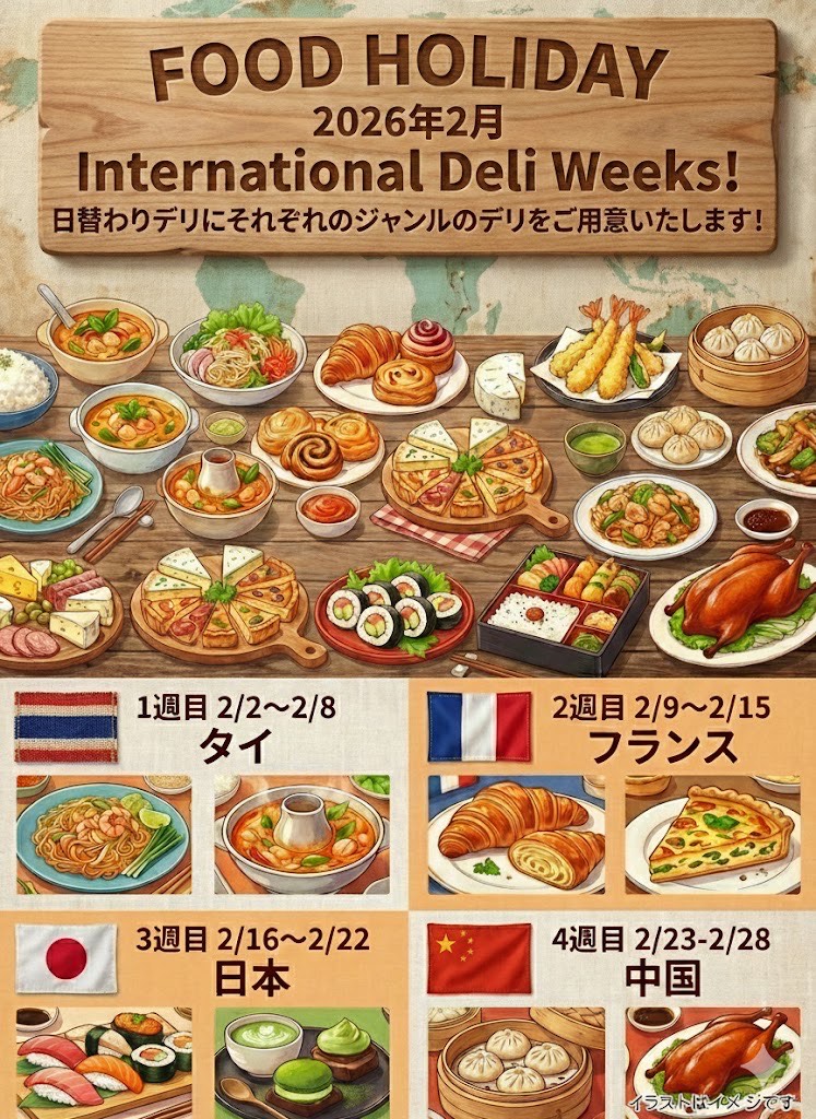 いつもFOOD HOLIDAYをご利用いただきありがとうございます! 2月はInternational Deli Week!を開催します。 ☆1週目 : 2/2〜2/8 タイ本場タイのシェフが腕を振るいます! ☆2週目 …